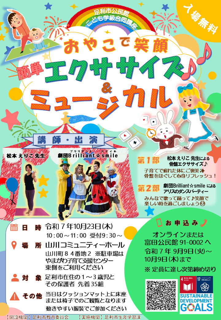 1~3歳児のお子様と保護者を対象に、簡単エクササイズ&ミュージカルを開催します。