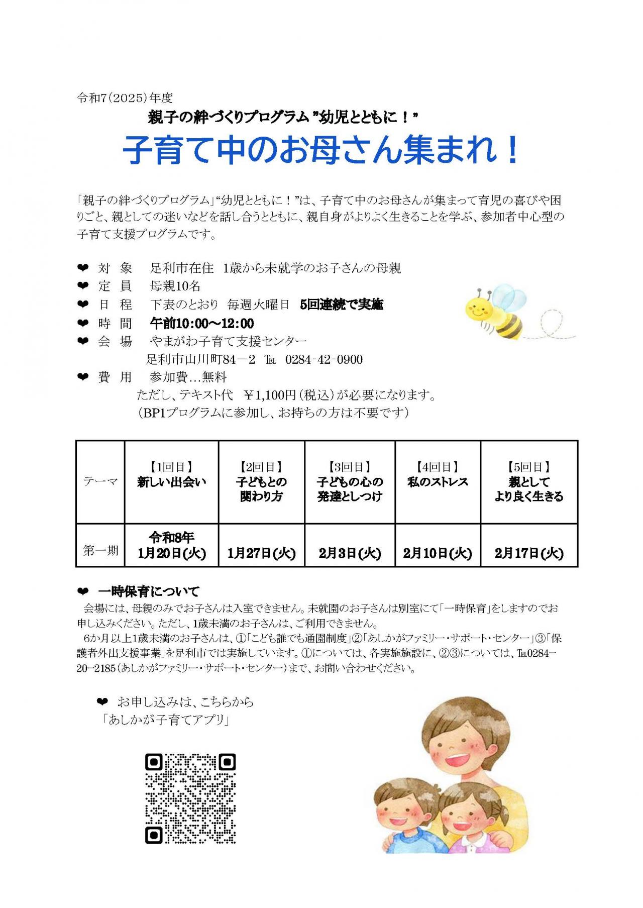 「親子の絆づくりプログラ‶幼児とともに!″」は、子育て中のお母さんが集まって育児の喜びや困りごと、親としての迷いなどを話し合うとともに、親自身がよりよく生きることを学ぶ、参加者中心型の子育て支援プログラムです。