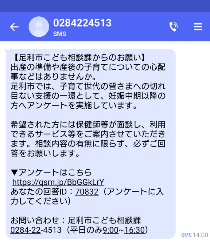 近年SMSを使った詐欺が増加しています。URLのリンクをタップすることに不安を感じる方は、こども相談課(0284-22-4513)にご連絡ください。アンケートを送付したかどうか確認いたします。